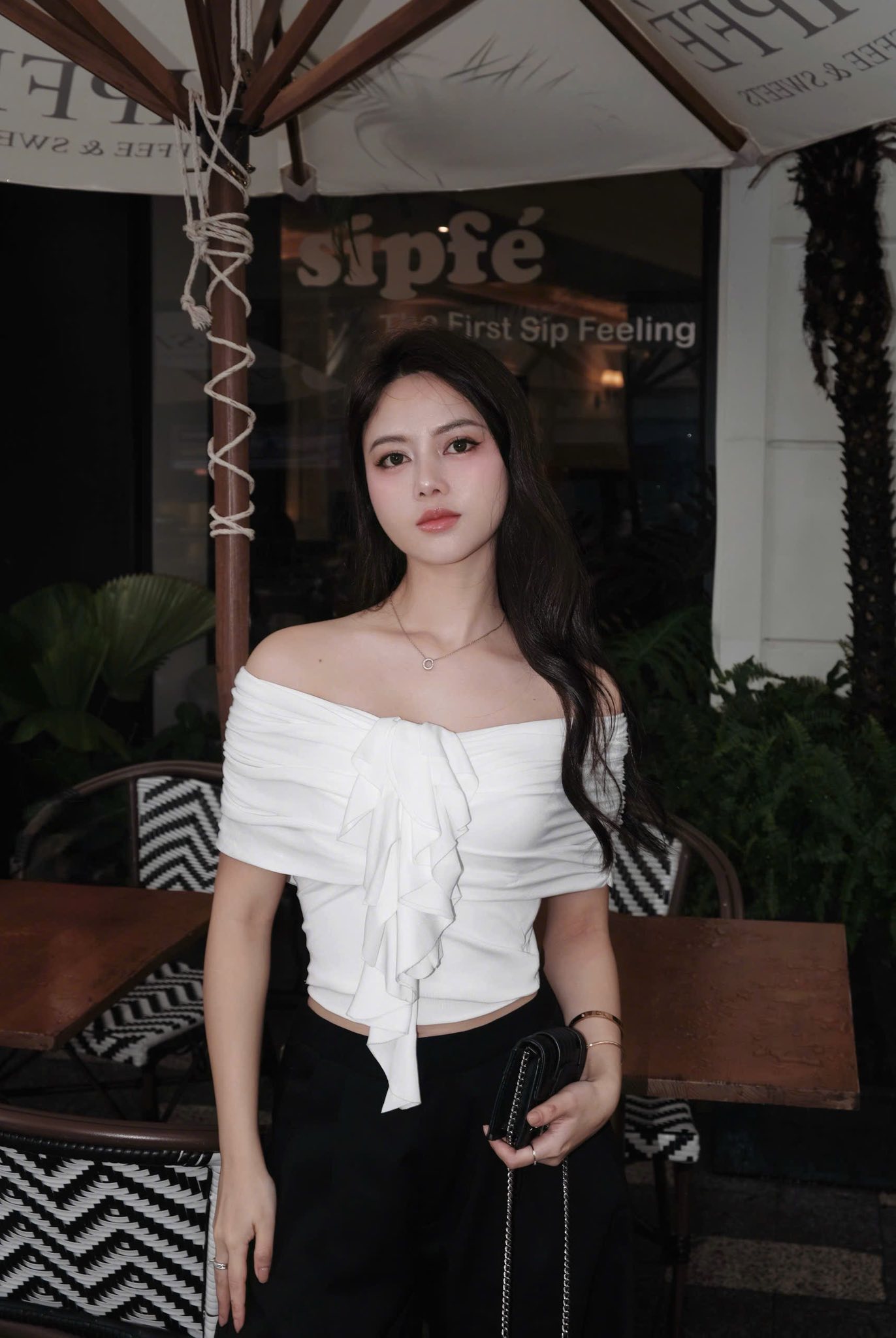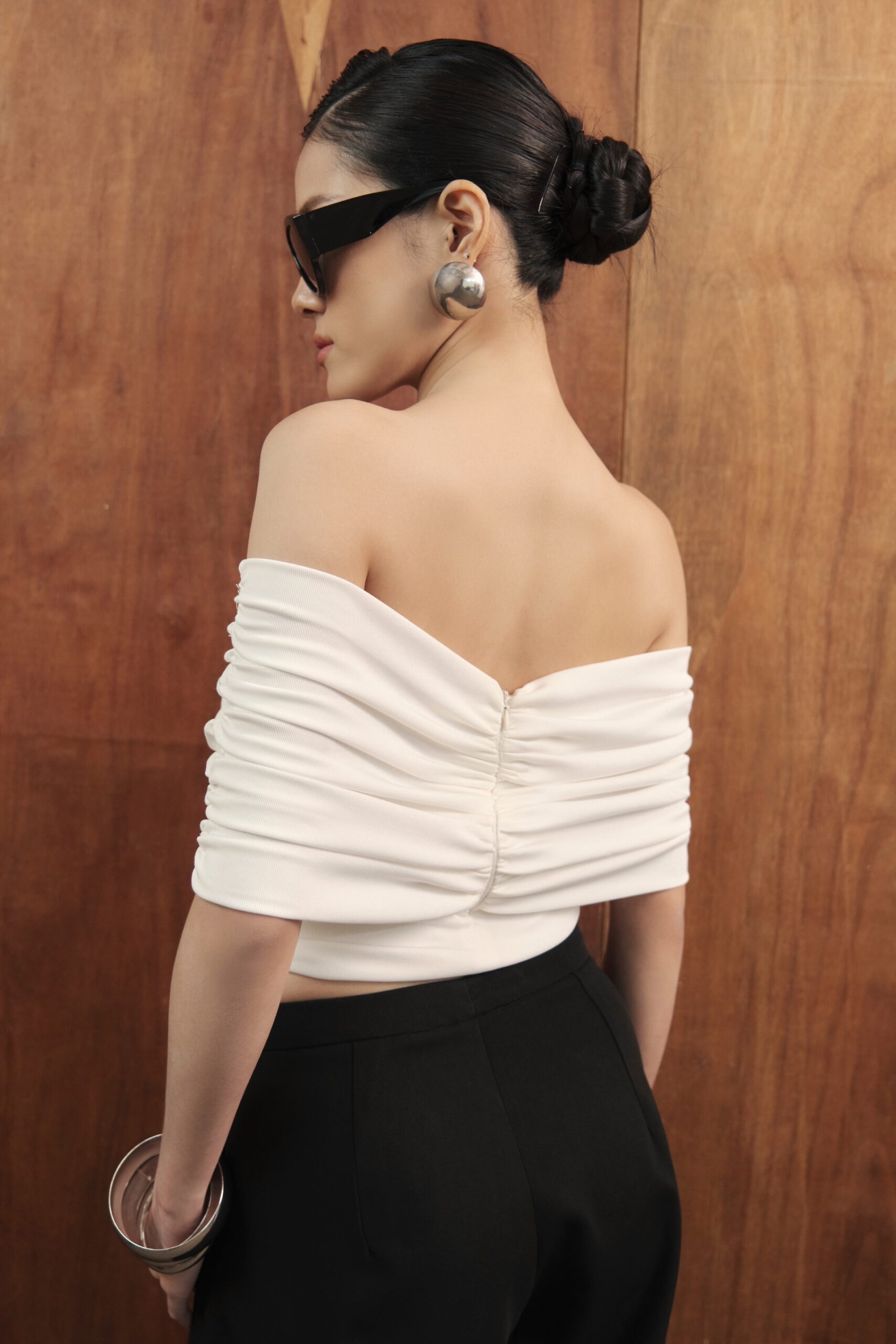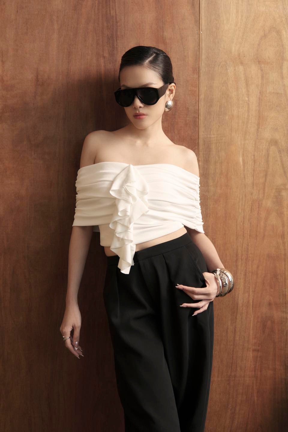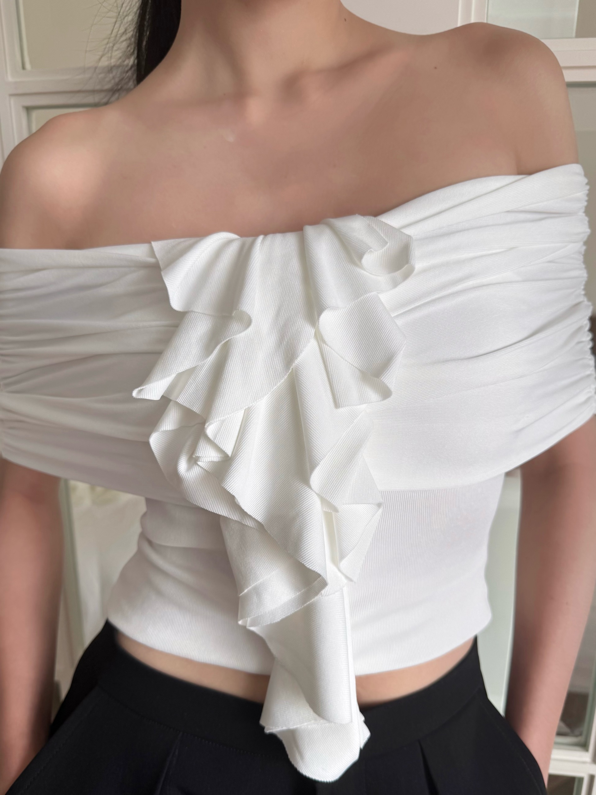 ✪ Áo ôm trễ vai, Điểm nhấn đặc biệt ở trúc ngực bèo nhún lớn hút mắt, mang hơi hướng couture-inspired