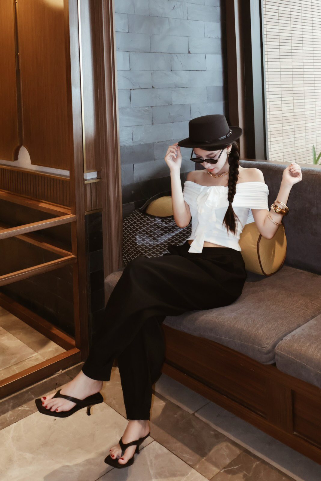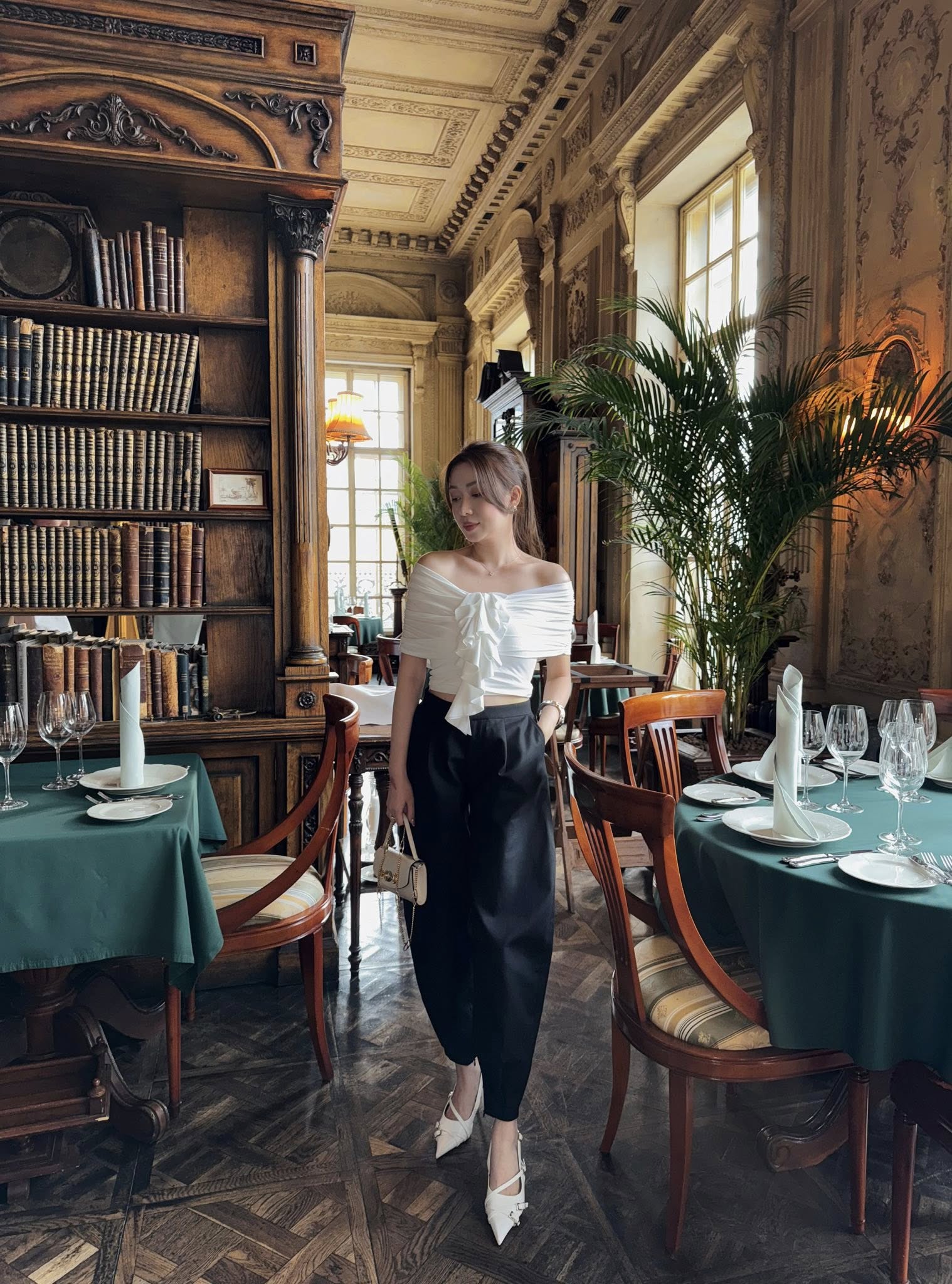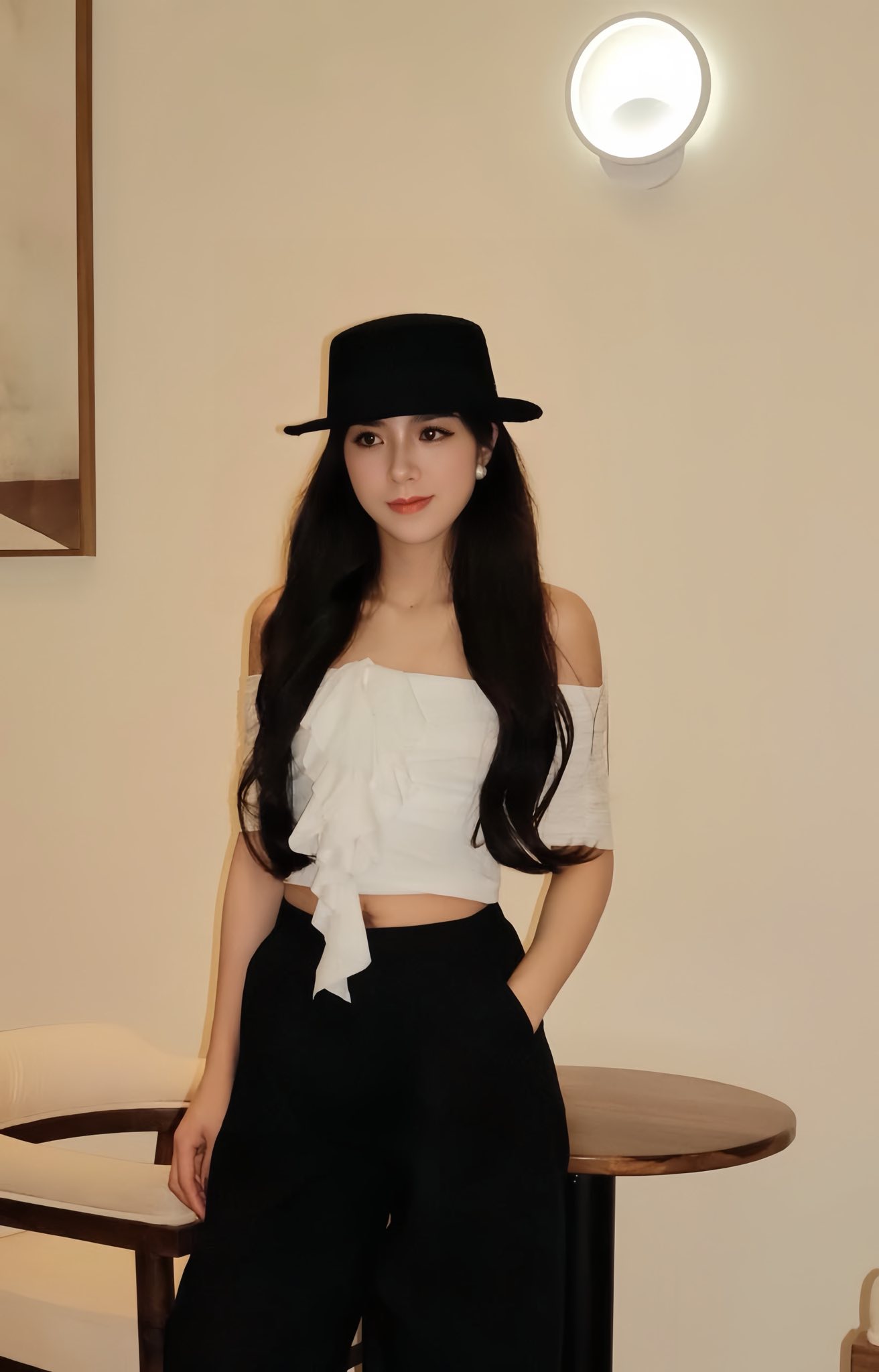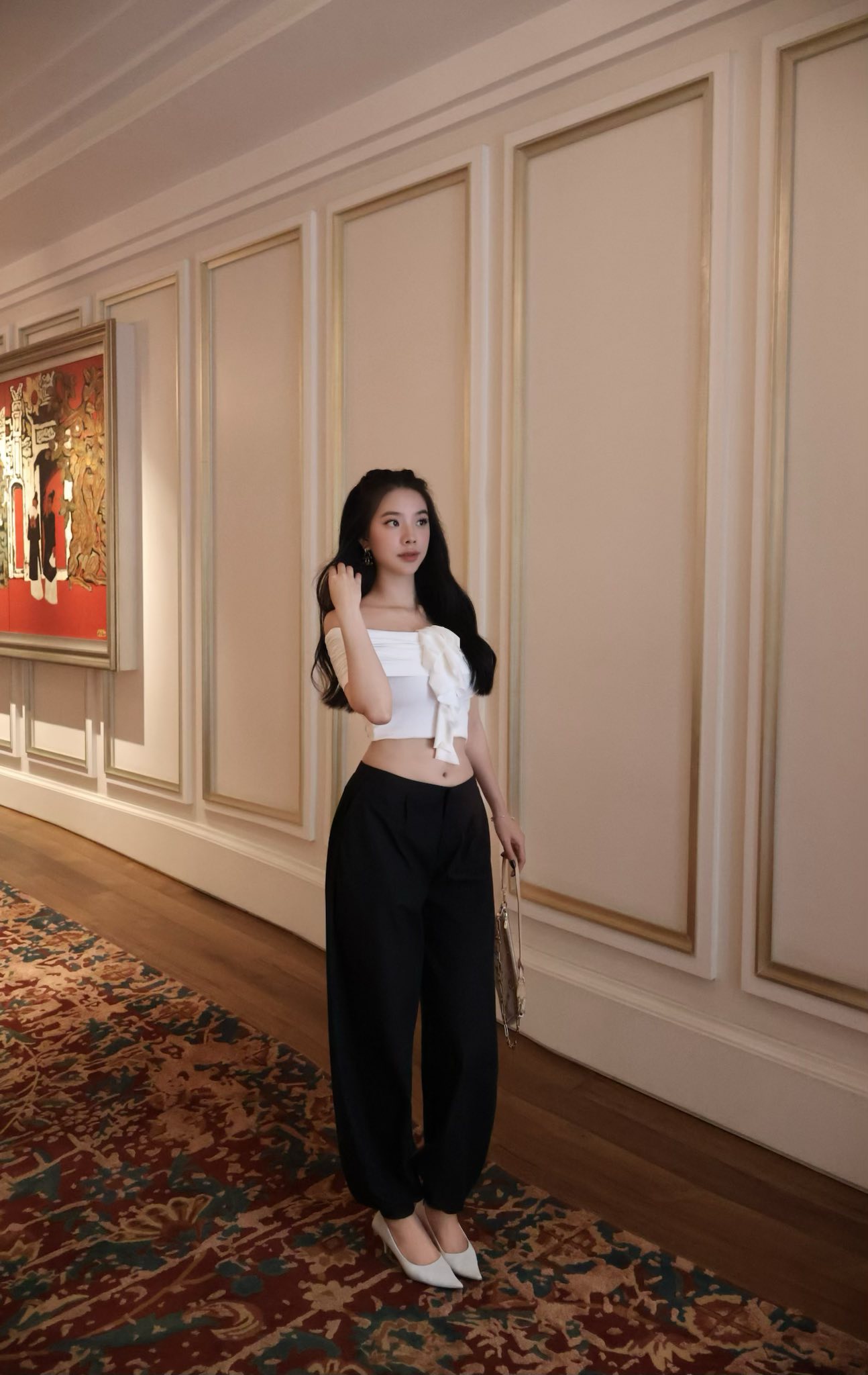 ✪ Áo ôm trễ vai, Điểm nhấn đặc biệt ở trúc ngực bèo nhún lớn hút mắt, mang hơi hướng couture-inspired